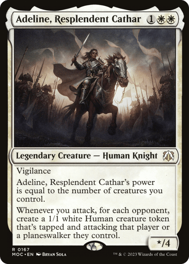 Vigilance Adeline's power is equal to the number of creatures you control. Whenever you attack, for each opponent, create a 1/1 white Human creature token that's tapped and attacking that player or a planeswalker they control.