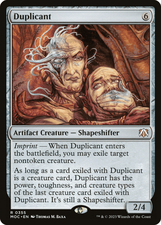 Abilities that define a * in a creature's power and toughness apply while that card is in exile, but abilities that add or subtract power and toughness don't. For example, the ability of Crusader of Odric applies to determine Duplicant's power and toughness, but the ability of Death's Shadow doesn't. — Duplicant's base power and toughness change to the imprinted card's power and toughness. Counters and other effects that modify Duplicant's power and toughness still apply. — Duplicant's power and toughness are constantly updated if the exiled card's power and/or toughness change. — If a melded permanent or a merged permanent is exiled by Duplicant's triggered ability, that ability's controller chooses the relative timestamp of the exiled cards. Duplicant looks at the information of the one with the latest timestamp.