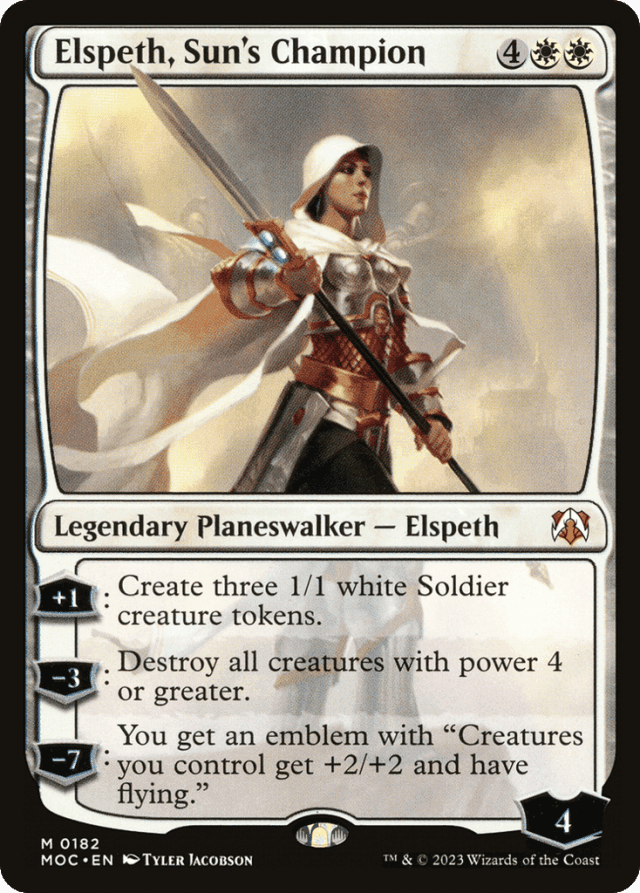 [+1]: Create three 1/1 white Soldier creature tokens. [−3]: Destroy all creatures with power 4 or greater. [−7]: You get an emblem with "Creatures you control get +2/+2 and have flying."