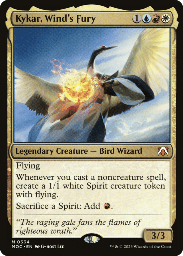 Flying Whenever you cast a noncreature spell, create a 1/1 white Spirit creature token with flying. Sacrifice a Spirit: Add {R}.