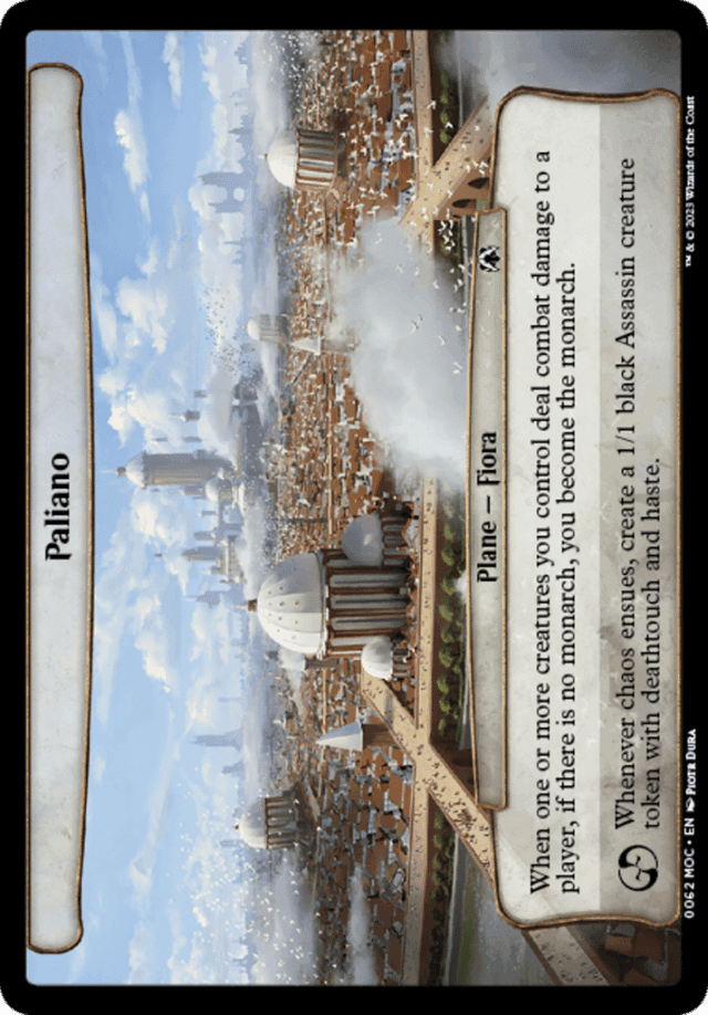 When one or more creatures you control deal combat damage to a player, if there is no monarch, you become the monarch. Whenever chaos ensues, create a 1/1 black Assassin creature token with deathtouch and haste.