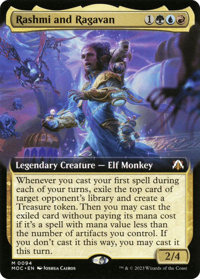 Check the number of artifacts you control as the ability resolves, including the Treasure token you just created, to see if you can cast the exiled card without paying its mana cost. — If the spell has {X} in its mana cost, you must choose 0 as the value of X when casting it without paying its mana cost. — If you cast a spell without paying its mana cost, you can’t choose to cast it for any alternative costs. You can, however, pay any additional costs. If the spell has any mandatory additional costs, you must pay those. — If you cast the spell without paying its mana cost, you do so during the resolution of the triggered ability. Timing restrictions of that spell based on card type are ignored. It will resolve before the spell that caused the ability to trigger. — If you don’t cast it without paying its mana cost but rather cast it later in the turn, you must pay its costs, and you must follow all applicable timing rules. For example, if the card is a creature card, you can cast that card by paying its mana cost only during your main phase while the stack is empty. — If you don’t cast the card at all, it remains exiled. — Rashmi and Ragavan has to be on the battlefield at the moment you cast your first spell. Notably, on the turn you cast Rashmi and Ragavan, the ability won’t trigger for you that turn. If a spell causes Rashmi and Ragavan to leave the battlefield as an additional cost to cast it, the ability won’t trigger. — Rashmi and Ragavan’s ability resolves before the spell that caused it to trigger, but not before you have to pay for the original spell. You won’t be able to use the Treasure token you create to pay for it.