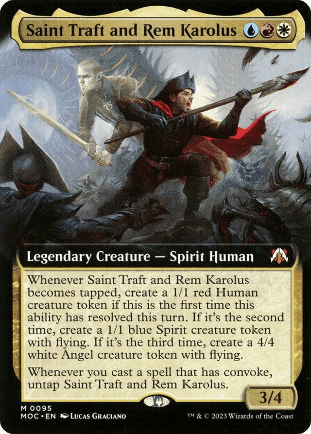 Whenever Saint Traft and Rem Karolus becomes tapped, create a 1/1 red Human creature token if this is the first time this ability has resolved this turn. If it's the second time, create a 1/1 blue Spirit creature token with flying. If it's the third time, create a 4/4 white Angel creature token with flying. Whenever you cast a spell that has convoke, untap Saint Traft and Rem Karolus.