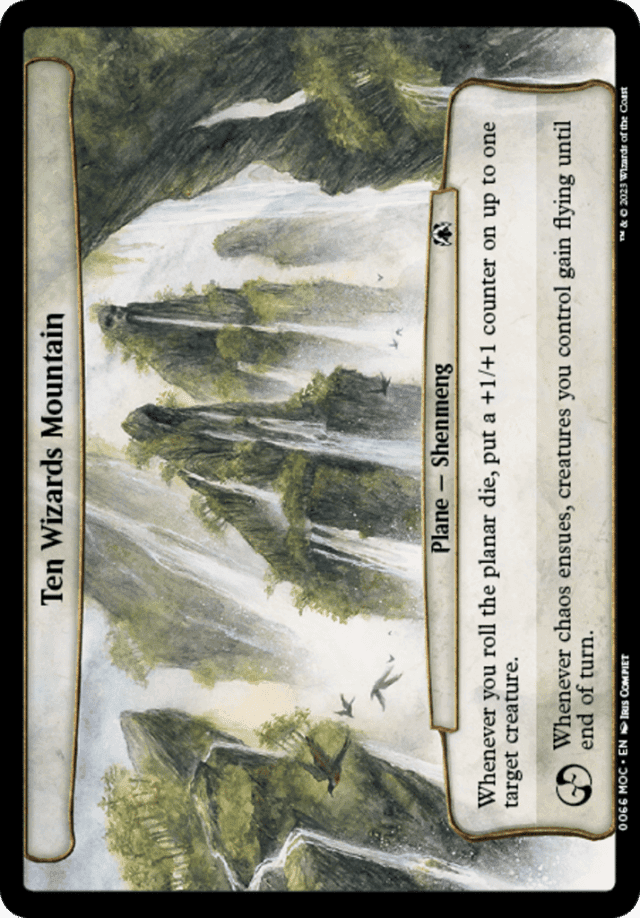 Whenever you roll the planar die, put a +1/+1 counter on up to one target creature. Whenever chaos ensues, creatures you control gain flying until end of turn.