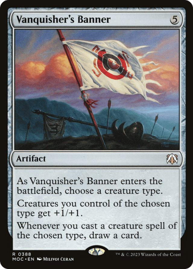 The choice of creature type is made as Vanquisher's Banner enters the battlefield. Players can't respond to this choice. The bonus starts applying immediately. — The last ability of Vanquisher's Banner resolves before the spell that caused it to trigger. The ability will resolve even if the creature spell is countered. — Because damage remains marked on a creature until the damage is removed as the turn ends, nonlethal damage dealt to a creature you control of the chosen type may become lethal if Vanquisher's Banner leaves the battlefield during that turn. — The choice of creature type is made as Vanquisher's Banner enters the battlefield. Players can't respond to this choice. The bonus starts applying immediately. — The last ability of Vanquisher's Banner resolves before the spell that caused it to trigger. The ability will resolve even if the creature spell is countered. — To choose a creature type, you must choose an existing creature type, such as Fungus or Sliver. You can't choose multiple creature types, such as Fungus Sliver. Card types such as artifact can't be chosen, nor can subtypes that aren't creature types, such as Jace, Vehicle, or Treasure.