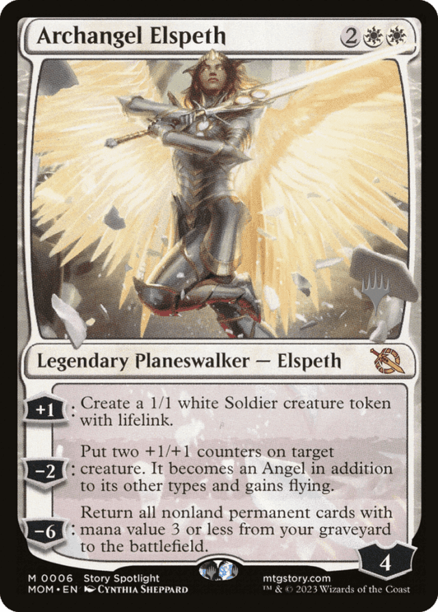 [+1]: Create a 1/1 white Soldier creature token with lifelink. [−2]: Put two +1/+1 counters on target creature. It becomes an Angel in addition to its other types and gains flying. [−6]: Return all nonland permanent cards with mana value 3 or less from your graveyard to the battlefield.