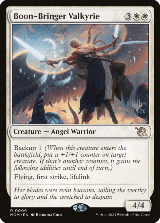 Backup 1 (When this creature enters, put a +1/+1 counter on target creature. If that's another creature, it gains the following abilities until end of turn.) Flying, first strike, lifelink
