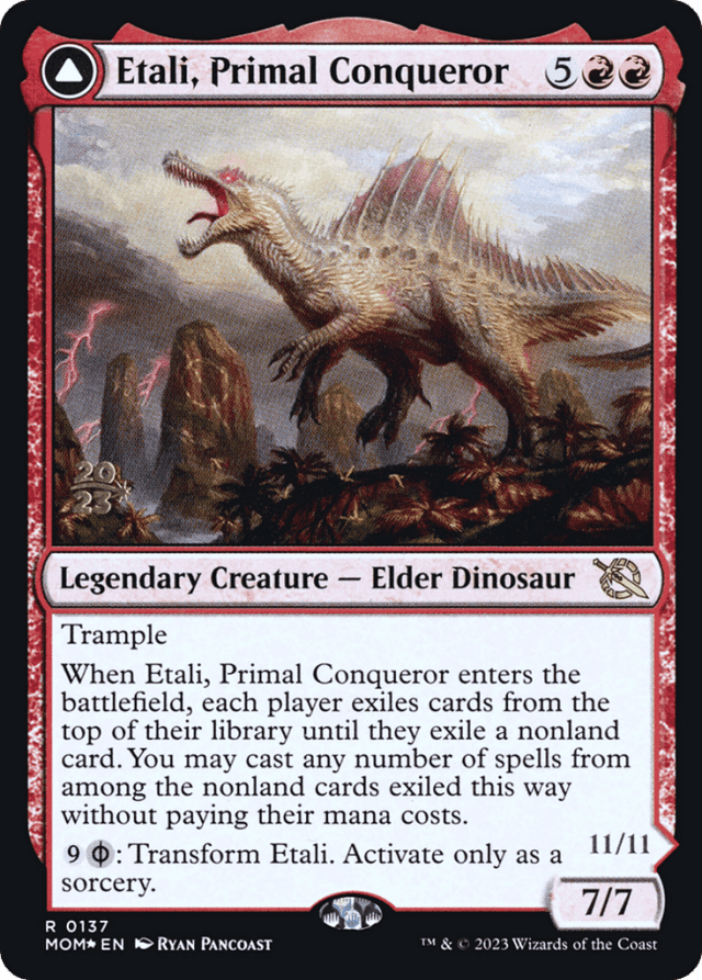 Any cards not cast, including land cards, remain in exile. They can’t be cast on later turns. — If an exiled card has {X} in its mana cost, you must choose 0 as the value of X when casting it without paying its mana cost. — If you cast a card “without paying its mana cost,” you can’t pay any alternative costs. You can, however, pay additional costs. If the card has any mandatory additional costs, those must be paid to cast the card. — If you cast any of the exiled cards, you do so as part of the resolution of the triggered ability. You can’t wait to cast them later in the turn. Timing restrictions based on a card’s type are ignored. — If you cast more than one of the exiled cards, you choose the order in which to cast them. A spell you cast this way can be the target of a later spell you cast this way. However, permanent spells cast this way won’t resolve until you’re done casting spells, so the permanents they become can’t be the target of spells cast this way. For example, if you exile Twincast and Lightning Strike, you can cast Lightning Strike and then cast Twincast targeting it; but if you exile a creature card and an Aura card, you can’t cast that Aura targeting that creature. — In a multiplayer game, if a player leaves the game, all cards that player owns leave as well. If you leave the game, any spells or permanents you control from Etali’s ability are exiled. — Losing the game because a player (preferably an opponent) has ten or more poison counters is a rule of the game. Etali, Primal Sickness doesn’t have to still be on the battlefield when someone (preferably an opponent) gets their tenth poison counter.