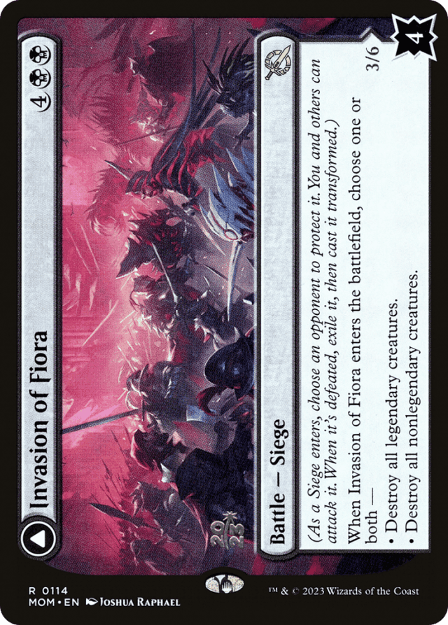 A Siege’s controller can’t be its protector. If a Siege’s protector ever gains control of it, they choose a new player to be its protector. This is a state-based action. — A battle can be attacked by all players other than its protector. Notably, this means a Siege’s controller can attack it. — A battle can be dealt damage and be target of spells and/or abilities that target “any target.” — A battle’s “defense” is displayed in the bottom right corner of the card. A battle enters the battlefield with that number of defense counters. If another permanent enters the battlefield as a copy of a battle, it also enters with that number of defense counters. — As a Siege enters the battlefield, its controller chooses an opponent to be its protector. — Battles can’t attack or block, even if one also becomes a creature. If an attacking or blocking creature somehow becomes a battle in addition to being a creature, it is removed from combat. — Damage dealt to a battle causes that many defense counters to be removed from it. — If a Siege never had defense counters on it (perhaps because a permanent became a copy of one), it can’t have its last defense counter removed. It will be put into its owner’s graveyard. You won’t exile it or cast the other face. — If a battle has no defense counters, and it isn’t the source of a triggered ability that has triggered but not yet left the stack, that battle is put into its owner’s graveyard. This is a state-based action. This doesn’t cause a Siege’s intrinsic triggered ability to trigger. — If a battle that’s being attacked somehow stops being a battle, it is removed from combat. Similarly, if its controller changes in the middle of combat, it is removed from combat. — If a non-battle permanent that is already on the battlefield become a copy of a Siege, its controller chooses one of their opponents to be that battle’s protector. However, it will most likely be put into its owner’s graveyard because it has no defense counters (see below). — If a permanent that is represented by a transforming double-faced card becomes a copy of a Siege, it will be exiled as that Siege’s triggered ability resolves, then it will be cast transformed. Note that this applies only to transforming double-faced cards, not to modal double-faced cards that can normally be played using either face. — If a token or a card that isn’t represented by a transforming double-faced card becomes a copy of a Siege, it can’t be cast as its triggered ability resolves. It will remain in exile. If it’s a token, it will cease to exist the next time state-based actions are performed. — If you choose both modes for Invasion of Fiora’s enters-the-battlefield ability, the modes happen in order. First all legendary creatures are destroyed, then all nonlegendary creatures. — In a multiplayer game, if the protector of a battle leaves the game and that battle is not currently being attacked, its controller chooses a new protector for it as a state-based action. If it is being attacked, its controller chooses a new protector for it once no creatures are attacking it. This means that it continues to be attacked and can be dealt combat damage as normal. — Only creatures controlled by a battle’s protector can block creatures that are attacking that battle. This means a Siege’s controller can never assign creatures to block for it. — Sieges each have an intrinsic triggered ability. That ability is “When the last defense counter is removed from this permanent, exile it, then you may cast it transformed without paying its mana cost.”