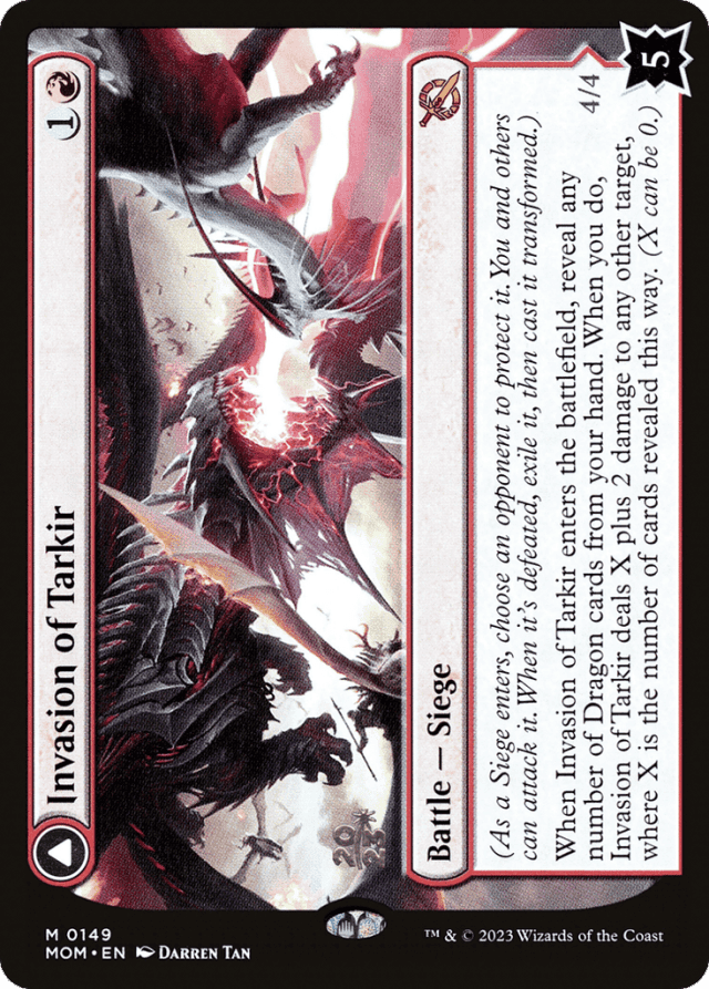 A Siege’s controller can’t be its protector. If a Siege’s protector ever gains control of it, they choose a new player to be its protector. This is a state-based action. — A battle can be attacked by all players other than its protector. Notably, this means a Siege’s controller can attack it. — A battle can be dealt damage and be target of spells and/or abilities that target “any target.” — A battle’s “defense” is displayed in the bottom right corner of the card. A battle enters the battlefield with that number of defense counters. If another permanent enters the battlefield as a copy of a battle, it also enters with that number of defense counters. — As a Siege enters the battlefield, its controller chooses an opponent to be its protector. — Battles can’t attack or block, even if one also becomes a creature. If an attacking or blocking creature somehow becomes a battle in addition to being a creature, it is removed from combat. — Damage dealt to a battle causes that many defense counters to be removed from it. — If a Siege never had defense counters on it (perhaps because a permanent became a copy of one), it can’t have its last defense counter removed. It will be put into its owner’s graveyard. You won’t exile it or cast the other face. — If a battle has no defense counters, and it isn’t the source of a triggered ability that has triggered but not yet left the stack, that battle is put into its owner’s graveyard. This is a state-based action. This doesn’t cause a Siege’s intrinsic triggered ability to trigger. — If a battle that’s being attacked somehow stops being a battle, it is removed from combat. Similarly, if its controller changes in the middle of combat, it is removed from combat. — If a non-battle permanent that is already on the battlefield become a copy of a Siege, its controller chooses one of their opponents to be that battle’s protector. However, it will most likely be put into its owner’s graveyard because it has no defense counters (see below). — If a permanent that is represented by a transforming double-faced card becomes a copy of a Siege, it will be exiled as that Siege’s triggered ability resolves, then it will be cast transformed. Note that this applies only to transforming double-faced cards, not to modal double-faced cards that can normally be played using either face. — If a token or a card that isn’t represented by a transforming double-faced card becomes a copy of a Siege, it can’t be cast as its triggered ability resolves. It will remain in exile. If it’s a token, it will cease to exist the next time state-based actions are performed. — If you don’t reveal any Dragon cards from your hand, the reflexive triggered ability will cause Invasion of Tarkir to deal 2 damage to the target of the ability. — In a multiplayer game, if the protector of a battle leaves the game and that battle is not currently being attacked, its controller chooses a new protector for it as a state-based action. If it is being attacked, its controller chooses a new protector for it once no creatures are attacking it. This means that it continues to be attacked and can be dealt combat damage as normal. — Invasion of Tarkir’s enters-the-battlefield ability triggers and goes on the stack without a target. As it resolves, you’ll reveal any number of Dragon cards from your hand. As the card reminds you, that number can be zero. Then the second “reflexive” triggered ability will trigger. You’ll choose the target for that second ability at that time. — Only creatures controlled by a battle’s protector can block creatures that are attacking that battle. This means a Siege’s controller can never assign creatures to block for it. — Sieges each have an intrinsic triggered ability. That ability is “When the last defense counter is removed from this permanent, exile it, then you may cast it transformed without paying its mana cost.”