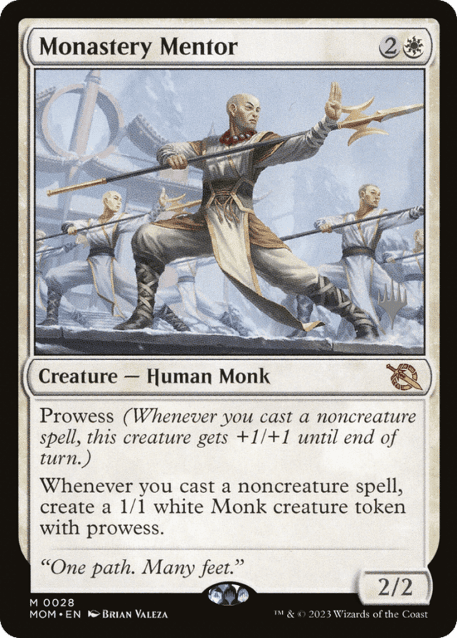 Prowess (Whenever you cast a noncreature spell, this creature gets +1/+1 until end of turn.) Whenever you cast a noncreature spell, create a 1/1 white Monk creature token with prowess.