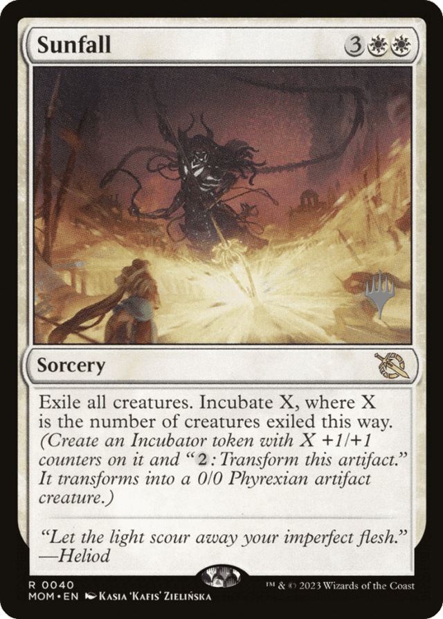 Exile all creatures. Incubate X, where X is the number of creatures exiled this way. (Create an Incubator token with X +1/+1 counters on it and "{2}: Transform this token." It transforms into a 0/0 Phyrexian artifact creature.)