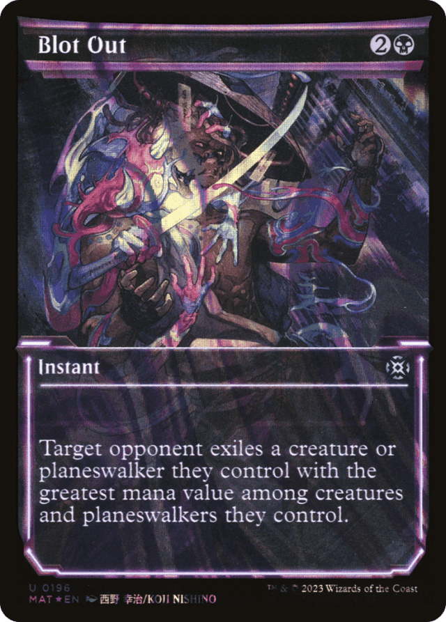 Blot Out targets only the opponent, not any permanent. A permanent with hexproof may be exiled this way if its mana value is the greatest, for example. — Consider all creatures and planeswalkers the target opponent controls as one group to see which one has the greatest mana value. For example, if the opponent controls a creature with mana value 3 and a planeswalker with mana value 5, they must exile the planeswalker. — Which creature or planeswalker will be exiled is determined as Blot Out resolves.