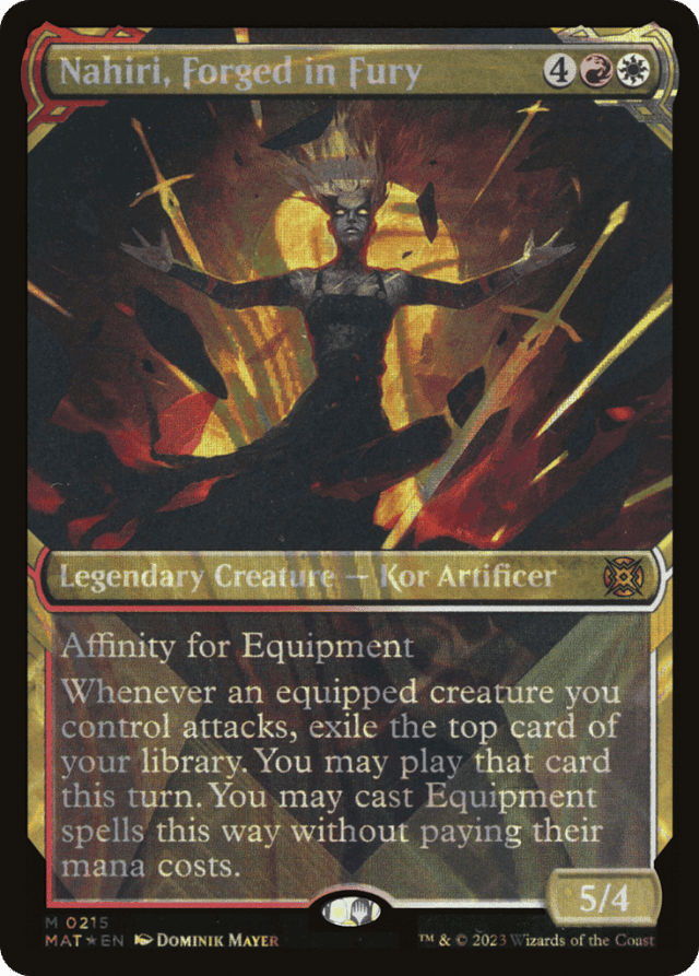 An "equipped creature you control" is any creature you control with one or more Equipment attached to it. — If you cast an Equipment spell this way, you may choose to pay its mana cost if you want to. — If you don't play the card, it will remain exiled. — Nahiri's last ability will trigger once for each equipped creature you control that attacks, no matter how many Equipment are attached to any of them. — One reason you might want to pay its mana cost is if there's an {X} in its mana cost. If you cast such a spell without paying its mana cost, you must choose 0 as the value of X. (If you pay its mana cost, you may choose the value of X as normal.) — Playing the exiled card follows the normal rules for playing that card. Unless you're casting an Equipment spell this way, you must pay the spell's costs, and you must follow all applicable timing rules. For example, if the card is a creature card, you can cast that card by paying its mana cost only during your main phase while the stack is empty. — Unless an effect allows you to play additional lands that turn, you can play a land card exiled with Nahiri only if you haven't played a land yet that turn. — You may play the card exiled with Nahiri's ability even if Nahiri or the equipped creature leaves the battlefield or you lose control of them.