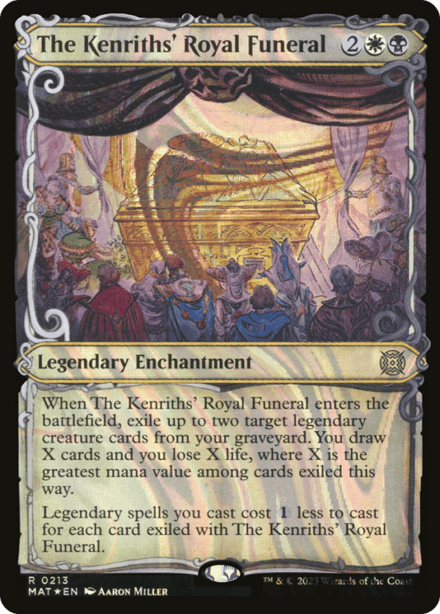 When The Kenriths' Royal Funeral enters, exile up to two target legendary creature cards from your graveyard. You draw X cards and you lose X life, where X is the greatest mana value among cards exiled this way. Legendary spells you cast cost {1} less to cast for each card exiled with The Kenriths' Royal Funeral.