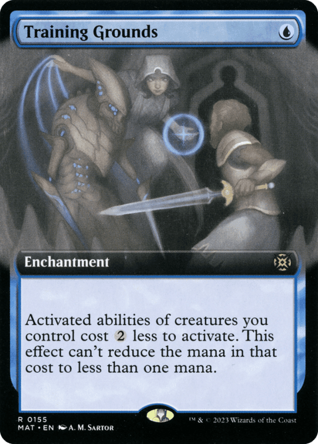 Training Grounds won't affect a cost that isn't the cost to activate a creature's activated ability. For example, it won't affect Flameblast Dragon's {X}{R} cost, since that's a cost paid when a triggered ability resolves, and it won't affect a kicker cost, since that's an additional cost to cast a spell. Activated ability costs appear before a colon (:) in a card's rules text, or, in the case of some keywords, before a colon in reminder text. — If an activated ability of a creature you control costs no generic mana to activate (for example, if it costs {R}{R}, it costs {0}, or it costs only nonmana actions such as {T} or "Sacrifice a creature"), Training Grounds simply won't affect it. In particular, it won't increase the cost to include a mana payment of {1}. — Training Grounds affects only creatures you control on the battlefield. The costs of activated abilities that work in other zones (such as cycling or unearth) won't be reduced. — Training Grounds can reduce the amount you pay for a creature's activated ability cost that includes {X}. For example, Drana, Kalastria Bloodchief has an activated ability that costs {X}{B}{B}. If you control Training Grounds and you activate the ability with X equal to 5, you'll have to pay only {3}{B}{B}. This is true even if the ability states that {X} must be paid with a certain color of mana, as Crimson Hellkite's ability does. — Training Grounds can reduce the part of an activation cost represented by generic mana symbols down to nothing, as long as it still costs at least one mana. For example, if an activation cost is {2}{G}, you'd have to pay only {G}. If an activation cost is {2}, though, you'd still have to pay {1}. — Training Grounds takes the total cost to activate a creature's activated ability into account, not just the cost printed on it. For example, Urabrask has an activated ability that costs {R}, and Suppression Field says "Activated abilities cost {2} more to activate unless they're mana abilities." Since activating Urabrask's activated ability would now cost {2}{R}, Training Grounds reduces that cost back to {R}. — Training Grounds won't affect the part of an activation cost represented by colored mana symbols or snow mana symbols. It also won't affect nonmana parts of an activation cost, if there are any.