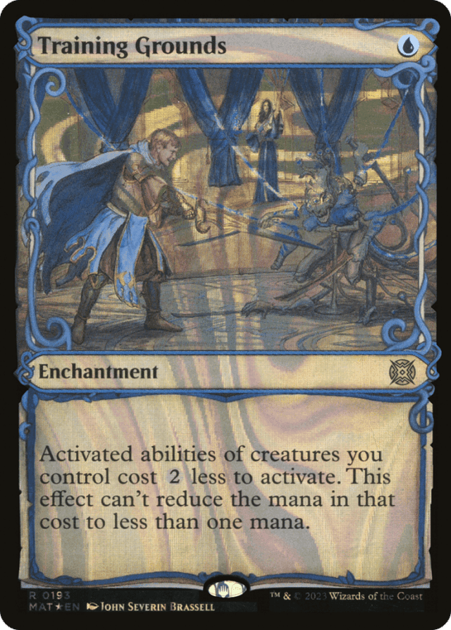 Training Grounds won't affect a cost that isn't the cost to activate a creature's activated ability. For example, it won't affect Flameblast Dragon's {X}{R} cost, since that's a cost paid when a triggered ability resolves, and it won't affect a kicker cost, since that's an additional cost to cast a spell. Activated ability costs appear before a colon (:) in a card's rules text, or, in the case of some keywords, before a colon in reminder text. — If an activated ability of a creature you control costs no generic mana to activate (for example, if it costs {R}{R}, it costs {0}, or it costs only nonmana actions such as {T} or "Sacrifice a creature"), Training Grounds simply won't affect it. In particular, it won't increase the cost to include a mana payment of {1}. — Training Grounds affects only creatures you control on the battlefield. The costs of activated abilities that work in other zones (such as cycling or unearth) won't be reduced. — Training Grounds can reduce the amount you pay for a creature's activated ability cost that includes {X}. For example, Drana, Kalastria Bloodchief has an activated ability that costs {X}{B}{B}. If you control Training Grounds and you activate the ability with X equal to 5, you'll have to pay only {3}{B}{B}. This is true even if the ability states that {X} must be paid with a certain color of mana, as Crimson Hellkite's ability does. — Training Grounds can reduce the part of an activation cost represented by generic mana symbols down to nothing, as long as it still costs at least one mana. For example, if an activation cost is {2}{G}, you'd have to pay only {G}. If an activation cost is {2}, though, you'd still have to pay {1}. — Training Grounds takes the total cost to activate a creature's activated ability into account, not just the cost printed on it. For example, Urabrask has an activated ability that costs {R}, and Suppression Field says "Activated abilities cost {2} more to activate unless they're mana abilities." Since activating Urabrask's activated ability would now cost {2}{R}, Training Grounds reduces that cost back to {R}. — Training Grounds won't affect the part of an activation cost represented by colored mana symbols or snow mana symbols. It also won't affect nonmana parts of an activation cost, if there are any.