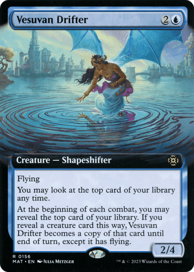 Any non-copy effect that began to apply to Vesuvan Drifter before it became a copy of a creature card will continue to apply to it after it becomes a copy. Auras and Equipment attached to Vesuvan Drifter will continue to work, as well as counters that change its power and toughness. — If the copied creature card has {X} in its mana cost, X is 0. — If the top card of your library changes while you're casting a spell, playing a land, or activating an ability, you can't look at the new top card until you finish doing so. This means that if you cast the top card of your library, you can't look at the next one until you're done paying for that spell. — Notably, while Vesuvan Drifter is a copy of another card, it doesn't have its own abilities. You won't be able to look at the top card of your library unless another effect allows you to do so. — Vesuvan Drifter copies exactly what was printed on the original creature card and nothing else, except it has flying. — Vesuvan Drifter lets you look at the top card of your library whenever you want (with one restriction—see below), even if you don't have priority. This action doesn't use the stack. Knowing what that card is becomes part of the information you have access to, just like you can look at the cards in your hand.