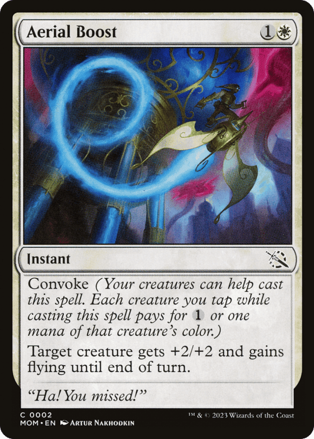 Convoke (Your creatures can help cast this spell. Each creature you tap while casting this spell pays for {1} or one mana of that creature's color.) Target creature gets +2/+2 and gains flying until end of turn.