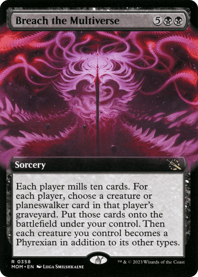 Each player mills ten cards. For each player, choose a creature or planeswalker card in that player's graveyard. Put those cards onto the battlefield under your control. Then each creature you control becomes a Phyrexian in addition to its other types.