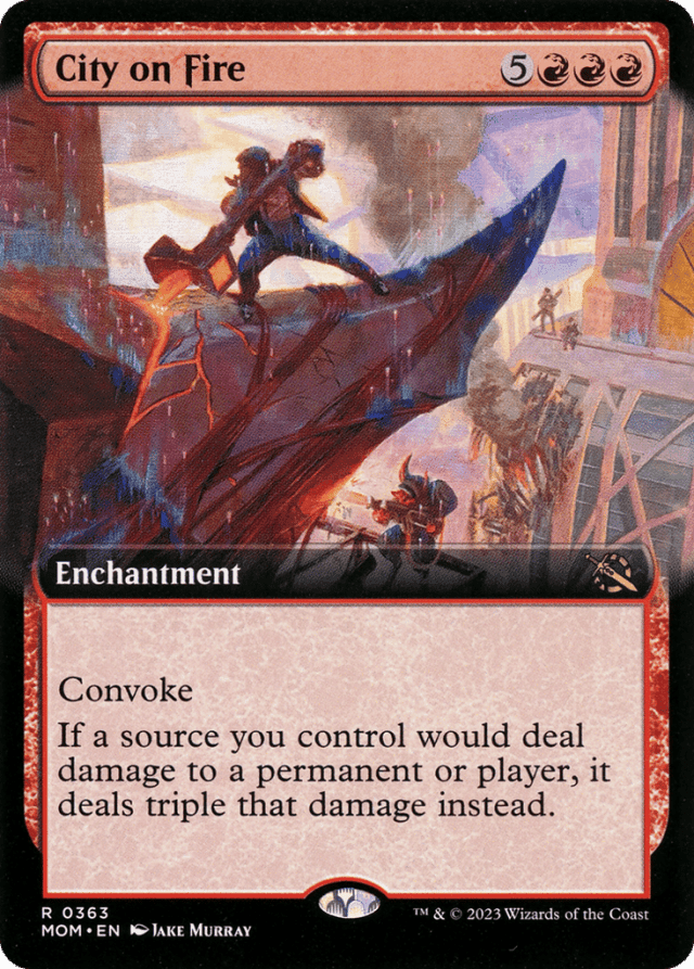 If an effect such as that of Chandra's Pyrohelix asks you to divide damage among targets, you must divide the unmodified damage before tripling it. — If you control two Cities on Fire, damage dealt by sources you control will be multiplied by 9. If you control three, it will be multiplied by 27, and so on. — While you control City on Fire, if a creature you control with trample would deal combat damage to a blocking creature, you must assign its unmodified damage. For example, a 3/3 creature with trample blocked by a 2/2 creature can have 1 damage assigned to the defending player. It will then deal 6 damage to the blocking creature (2 tripled) and 3 to the defending player (1 tripled). — Because convoke isn't an alternative cost, it can be used in conjunction with alternative costs. — If a creature you control has a mana ability with {T} in the cost, activating that ability while casting a spell with convoke will result in the creature being tapped before you pay the spell's costs. You won't be able to tap it again for convoke. Similarly, if you sacrifice a creature to activate a mana ability while casting a spell with convoke, that creature won't be on the battlefield when you pay the spell's costs, so you won't be able to tap it for convoke. — Tapping a multicolored creature using convoke will pay for {1} or one mana of your choice of any of that creature's colors. — Tapping an untapped creature that's attacking or blocking to convoke a spell won't cause that creature to stop attacking or blocking. — When calculating a spell's total cost, include any alternative costs, additional costs, or anything else that increases or reduces the cost to cast the spell. Convoke applies after the total cost is calculated. Convoke doesn't change a spell's mana cost or mana value. — You can tap any untapped creature you control to convoke a spell, even one you haven't controlled continuously since the beginning of your most recent turn.