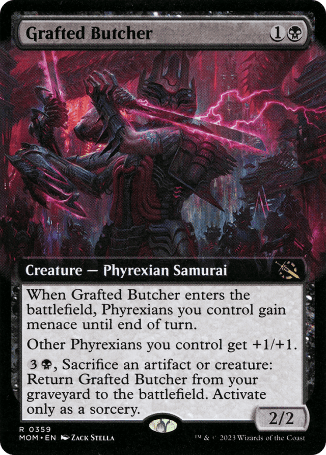 When this creature enters, Phyrexians you control gain menace until end of turn. Other Phyrexians you control get +1/+1. {3}{B}, Sacrifice an artifact or creature: Return this card from your graveyard to the battlefield. Activate only as a sorcery.