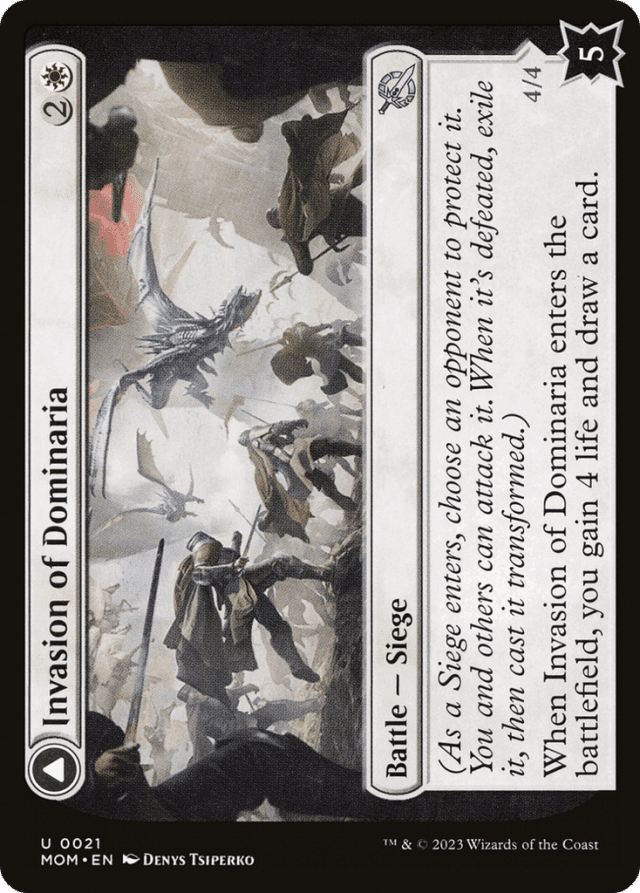 A Siege’s controller can’t be its protector. If a Siege’s protector ever gains control of it, they choose a new player to be its protector. This is a state-based action. — A battle can be attacked by all players other than its protector. Notably, this means a Siege’s controller can attack it. — A battle can be dealt damage and be target of spells and/or abilities that target “any target.” — A battle’s “defense” is displayed in the bottom right corner of the card. A battle enters the battlefield with that number of defense counters. If another permanent enters the battlefield as a copy of a battle, it also enters with that number of defense counters. — As a Siege enters the battlefield, its controller chooses an opponent to be its protector. — Battles can’t attack or block, even if one also becomes a creature. If an attacking or blocking creature somehow becomes a battle in addition to being a creature, it is removed from combat. — Damage dealt to a battle causes that many defense counters to be removed from it. — If a Siege never had defense counters on it (perhaps because a permanent became a copy of one), it can’t have its last defense counter removed. It will be put into its owner’s graveyard. You won’t exile it or cast the other face. — If a battle has no defense counters, and it isn’t the source of a triggered ability that has triggered but not yet left the stack, that battle is put into its owner’s graveyard. This is a state-based action. This doesn’t cause a Siege’s intrinsic triggered ability to trigger. — If a battle that’s being attacked somehow stops being a battle, it is removed from combat. Similarly, if its controller changes in the middle of combat, it is removed from combat. — If a non-battle permanent that is already on the battlefield become a copy of a Siege, its controller chooses one of their opponents to be that battle’s protector. However, it will most likely be put into its owner’s graveyard because it has no defense counters (see below). — If a permanent that is represented by a transforming double-faced card becomes a copy of a Siege, it will be exiled as that Siege’s triggered ability resolves, then it will be cast transformed. Note that this applies only to transforming double-faced cards, not to modal double-faced cards that can normally be played using either face. — If a token or a card that isn’t represented by a transforming double-faced card becomes a copy of a Siege, it can’t be cast as its triggered ability resolves. It will remain in exile. If it’s a token, it will cease to exist the next time state-based actions are performed. — In a multiplayer game, if the protector of a battle leaves the game and that battle is not currently being attacked, its controller chooses a new protector for it as a state-based action. If it is being attacked, its controller chooses a new protector for it once no creatures are attacking it. This means that it continues to be attacked and can be dealt combat damage as normal. — Only creatures controlled by a battle’s protector can block creatures that are attacking that battle. This means a Siege’s controller can never assign creatures to block for it. — Sieges each have an intrinsic triggered ability. That ability is “When the last defense counter is removed from this permanent, exile it, then you may cast it transformed without paying its mana cost.”