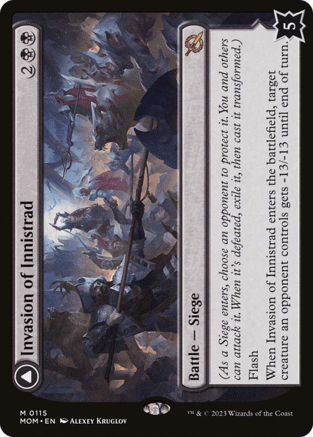 A Siege’s controller can’t be its protector. If a Siege’s protector ever gains control of it, they choose a new player to be its protector. This is a state-based action. — A battle can be attacked by all players other than its protector. Notably, this means a Siege’s controller can attack it. — A battle can be dealt damage and be target of spells and/or abilities that target “any target.” — A battle’s “defense” is displayed in the bottom right corner of the card. A battle enters the battlefield with that number of defense counters. If another permanent enters the battlefield as a copy of a battle, it also enters with that number of defense counters. — As a Siege enters the battlefield, its controller chooses an opponent to be its protector. — Battles can’t attack or block, even if one also becomes a creature. If an attacking or blocking creature somehow becomes a battle in addition to being a creature, it is removed from combat. — Damage dealt to a battle causes that many defense counters to be removed from it. — If a Siege never had defense counters on it (perhaps because a permanent became a copy of one), it can’t have its last defense counter removed. It will be put into its owner’s graveyard. You won’t exile it or cast the other face. — If a battle has no defense counters, and it isn’t the source of a triggered ability that has triggered but not yet left the stack, that battle is put into its owner’s graveyard. This is a state-based action. This doesn’t cause a Siege’s intrinsic triggered ability to trigger. — If a battle that’s being attacked somehow stops being a battle, it is removed from combat. Similarly, if its controller changes in the middle of combat, it is removed from combat. — If a non-battle permanent that is already on the battlefield become a copy of a Siege, its controller chooses one of their opponents to be that battle’s protector. However, it will most likely be put into its owner’s graveyard because it has no defense counters (see below). — If a permanent that is represented by a transforming double-faced card becomes a copy of a Siege, it will be exiled as that Siege’s triggered ability resolves, then it will be cast transformed. Note that this applies only to transforming double-faced cards, not to modal double-faced cards that can normally be played using either face. — If a token or a card that isn’t represented by a transforming double-faced card becomes a copy of a Siege, it can’t be cast as its triggered ability resolves. It will remain in exile. If it’s a token, it will cease to exist the next time state-based actions are performed. — In a multiplayer game, if the protector of a battle leaves the game and that battle is not currently being attacked, its controller chooses a new protector for it as a state-based action. If it is being attacked, its controller chooses a new protector for it once no creatures are attacking it. This means that it continues to be attacked and can be dealt combat damage as normal. — Only creatures controlled by a battle’s protector can block creatures that are attacking that battle. This means a Siege’s controller can never assign creatures to block for it. — Sieges each have an intrinsic triggered ability. That ability is “When the last defense counter is removed from this permanent, exile it, then you may cast it transformed without paying its mana cost.”