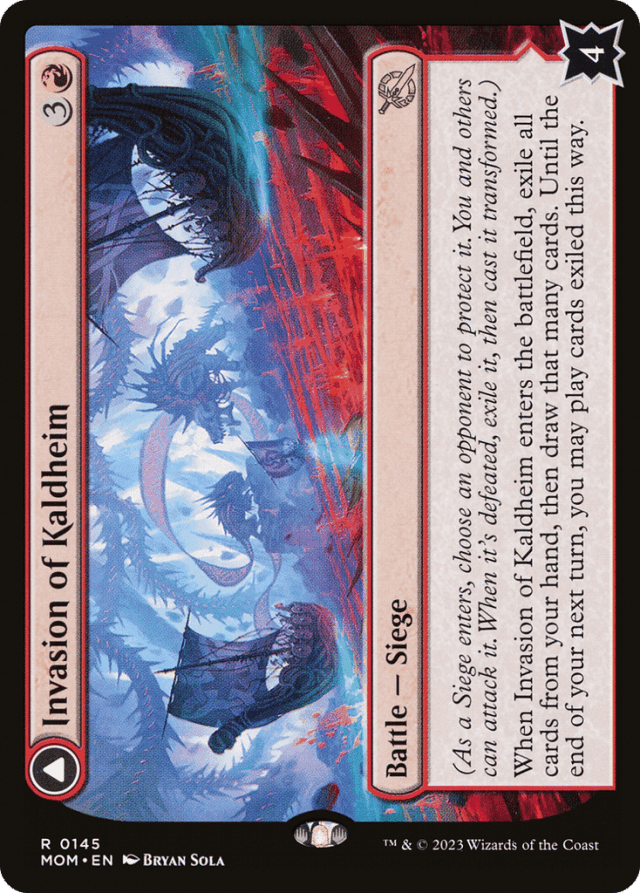 A Siege’s controller can’t be its protector. If a Siege’s protector ever gains control of it, they choose a new player to be its protector. This is a state-based action. — A battle can be attacked by all players other than its protector. Notably, this means a Siege’s controller can attack it. — A battle can be dealt damage and be target of spells and/or abilities that target “any target.” — A battle’s “defense” is displayed in the bottom right corner of the card. A battle enters the battlefield with that number of defense counters. If another permanent enters the battlefield as a copy of a battle, it also enters with that number of defense counters. — Any cards you don’t play will remain exiled. — As a Siege enters the battlefield, its controller chooses an opponent to be its protector. — Battles can’t attack or block, even if one also becomes a creature. If an attacking or blocking creature somehow becomes a battle in addition to being a creature, it is removed from combat. — Both Invasion of Kaldheim and Pyre of the World Tree have an ability that allow you to play cards from exile. You may play those cards during the specified duration even if the permanent with the ability leaves the battlefield or you lose control of it. — Damage dealt to a battle causes that many defense counters to be removed from it. — If a Siege never had defense counters on it (perhaps because a permanent became a copy of one), it can’t have its last defense counter removed. It will be put into its owner’s graveyard. You won’t exile it or cast the other face. — If a battle has no defense counters, and it isn’t the source of a triggered ability that has triggered but not yet left the stack, that battle is put into its owner’s graveyard. This is a state-based action. This doesn’t cause a Siege’s intrinsic triggered ability to trigger. — If a battle that’s being attacked somehow stops being a battle, it is removed from combat. Similarly, if its controller changes in the middle of combat, it is removed from combat. — If a non-battle permanent that is already on the battlefield become a copy of a Siege, its controller chooses one of their opponents to be that battle’s protector. However, it will most likely be put into its owner’s graveyard because it has no defense counters (see below). — If a permanent that is represented by a transforming double-faced card becomes a copy of a Siege, it will be exiled as that Siege’s triggered ability resolves, then it will be cast transformed. Note that this applies only to transforming double-faced cards, not to modal double-faced cards that can normally be played using either face. — If a token or a card that isn’t represented by a transforming double-faced card becomes a copy of a Siege, it can’t be cast as its triggered ability resolves. It will remain in exile. If it’s a token, it will cease to exist the next time state-based actions are performed. — If that ability triggers during the cleanup step because you discarded a land card to bring your hand size down to your maximum hand size, you will get priority after the ability resolves, so you’ll have a chance to cast an instant card or a card with flash you exiled. Whether you cast the exiled card or not, there will be then be another cleanup step before the turn ends. — In a multiplayer game, if the protector of a battle leaves the game and that battle is not currently being attacked, its controller chooses a new protector for it as a state-based action. If it is being attacked, its controller chooses a new protector for it once no creatures are attacking it. This means that it continues to be attacked and can be dealt combat damage as normal. — Only creatures controlled by a battle’s protector can block creatures that are attacking that battle. This means a Siege’s controller can never assign creatures to block for it. — Playing the exiled cards follows the normal rules for playing those cards. You must pay their costs, and you must follow all applicable timing rules. For example, if one of the cards is a creature card, you can cast that card by paying its mana cost only during your main phase while the stack is empty. — Sieges each have an intrinsic triggered ability. That ability is “When the last defense counter is removed from this permanent, exile it, then you may cast it transformed without paying its mana cost.” — The last ability of Pyre of the World Tree will trigger whenever you discard a land card for any reason, not just because you activated its other ability. — Unless an effect allows you to play additional lands that turn, you can play an exiled land card only if you haven’t played a land yet that turn.