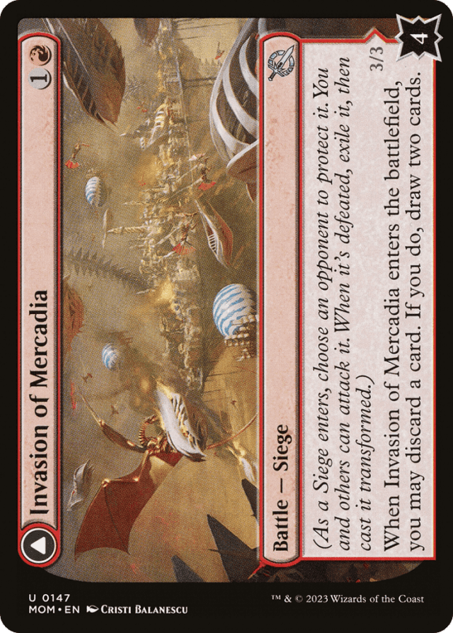 A Siege’s controller can’t be its protector. If a Siege’s protector ever gains control of it, they choose a new player to be its protector. This is a state-based action. — A battle can be attacked by all players other than its protector. Notably, this means a Siege’s controller can attack it. — A battle can be dealt damage and be target of spells and/or abilities that target “any target.” — A battle’s “defense” is displayed in the bottom right corner of the card. A battle enters the battlefield with that number of defense counters. If another permanent enters the battlefield as a copy of a battle, it also enters with that number of defense counters. — As a Siege enters the battlefield, its controller chooses an opponent to be its protector. — Battles can’t attack or block, even if one also becomes a creature. If an attacking or blocking creature somehow becomes a battle in addition to being a creature, it is removed from combat. — Damage dealt to a battle causes that many defense counters to be removed from it. — If a Siege never had defense counters on it (perhaps because a permanent became a copy of one), it can’t have its last defense counter removed. It will be put into its owner’s graveyard. You won’t exile it or cast the other face. — If a battle has no defense counters, and it isn’t the source of a triggered ability that has triggered but not yet left the stack, that battle is put into its owner’s graveyard. This is a state-based action. This doesn’t cause a Siege’s intrinsic triggered ability to trigger. — If a battle that’s being attacked somehow stops being a battle, it is removed from combat. Similarly, if its controller changes in the middle of combat, it is removed from combat. — If a non-battle permanent that is already on the battlefield become a copy of a Siege, its controller chooses one of their opponents to be that battle’s protector. However, it will most likely be put into its owner’s graveyard because it has no defense counters (see below). — If a permanent that is represented by a transforming double-faced card becomes a copy of a Siege, it will be exiled as that Siege’s triggered ability resolves, then it will be cast transformed. Note that this applies only to transforming double-faced cards, not to modal double-faced cards that can normally be played using either face. — If a token or a card that isn’t represented by a transforming double-faced card becomes a copy of a Siege, it can’t be cast as its triggered ability resolves. It will remain in exile. If it’s a token, it will cease to exist the next time state-based actions are performed. — In a multiplayer game, if the protector of a battle leaves the game and that battle is not currently being attacked, its controller chooses a new protector for it as a state-based action. If it is being attacked, its controller chooses a new protector for it once no creatures are attacking it. This means that it continues to be attacked and can be dealt combat damage as normal. — Only creatures controlled by a battle’s protector can block creatures that are attacking that battle. This means a Siege’s controller can never assign creatures to block for it. — Sieges each have an intrinsic triggered ability. That ability is “When the last defense counter is removed from this permanent, exile it, then you may cast it transformed without paying its mana cost.” — The set of creatures affected by Kyren Flamewright’s ability is determined as the ability resolves. The Elemental tokens will get the bonuses, but creatures you begin to control later in the turn and noncreature permanents that become creatures later in the turn will not.