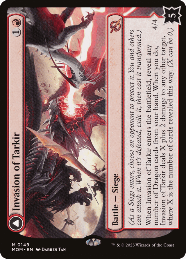 A Siege’s controller can’t be its protector. If a Siege’s protector ever gains control of it, they choose a new player to be its protector. This is a state-based action. — A battle can be attacked by all players other than its protector. Notably, this means a Siege’s controller can attack it. — A battle can be dealt damage and be target of spells and/or abilities that target “any target.” — A battle’s “defense” is displayed in the bottom right corner of the card. A battle enters the battlefield with that number of defense counters. If another permanent enters the battlefield as a copy of a battle, it also enters with that number of defense counters. — As a Siege enters the battlefield, its controller chooses an opponent to be its protector. — Battles can’t attack or block, even if one also becomes a creature. If an attacking or blocking creature somehow becomes a battle in addition to being a creature, it is removed from combat. — Damage dealt to a battle causes that many defense counters to be removed from it. — If a Siege never had defense counters on it (perhaps because a permanent became a copy of one), it can’t have its last defense counter removed. It will be put into its owner’s graveyard. You won’t exile it or cast the other face. — If a battle has no defense counters, and it isn’t the source of a triggered ability that has triggered but not yet left the stack, that battle is put into its owner’s graveyard. This is a state-based action. This doesn’t cause a Siege’s intrinsic triggered ability to trigger. — If a battle that’s being attacked somehow stops being a battle, it is removed from combat. Similarly, if its controller changes in the middle of combat, it is removed from combat. — If a non-battle permanent that is already on the battlefield become a copy of a Siege, its controller chooses one of their opponents to be that battle’s protector. However, it will most likely be put into its owner’s graveyard because it has no defense counters (see below). — If a permanent that is represented by a transforming double-faced card becomes a copy of a Siege, it will be exiled as that Siege’s triggered ability resolves, then it will be cast transformed. Note that this applies only to transforming double-faced cards, not to modal double-faced cards that can normally be played using either face. — If a token or a card that isn’t represented by a transforming double-faced card becomes a copy of a Siege, it can’t be cast as its triggered ability resolves. It will remain in exile. If it’s a token, it will cease to exist the next time state-based actions are performed. — If you don’t reveal any Dragon cards from your hand, the reflexive triggered ability will cause Invasion of Tarkir to deal 2 damage to the target of the ability. — In a multiplayer game, if the protector of a battle leaves the game and that battle is not currently being attacked, its controller chooses a new protector for it as a state-based action. If it is being attacked, its controller chooses a new protector for it once no creatures are attacking it. This means that it continues to be attacked and can be dealt combat damage as normal. — Invasion of Tarkir’s enters-the-battlefield ability triggers and goes on the stack without a target. As it resolves, you’ll reveal any number of Dragon cards from your hand. As the card reminds you, that number can be zero. Then the second “reflexive” triggered ability will trigger. You’ll choose the target for that second ability at that time. — Only creatures controlled by a battle’s protector can block creatures that are attacking that battle. This means a Siege’s controller can never assign creatures to block for it. — Sieges each have an intrinsic triggered ability. That ability is “When the last defense counter is removed from this permanent, exile it, then you may cast it transformed without paying its mana cost.”