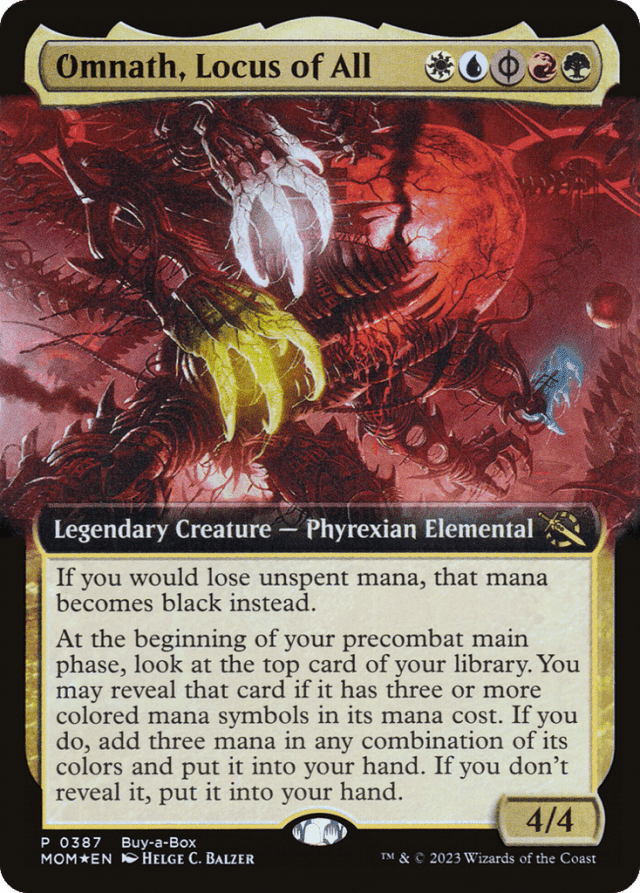 If you would lose unspent mana, that mana becomes black instead. At the beginning of your first main phase, look at the top card of your library. You may reveal that card if it has three or more colored mana symbols in its mana cost. If you do, add three mana in any combination of its colors and put it into your hand. If you don't reveal it, put it into your hand.