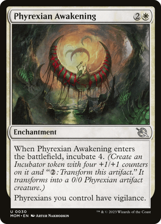 When this enchantment enters, incubate 4. (Create an Incubator token with four +1/+1 counters on it and "{2}: Transform this token." It transforms into a 0/0 Phyrexian artifact creature.) Phyrexians you control have vigilance.
