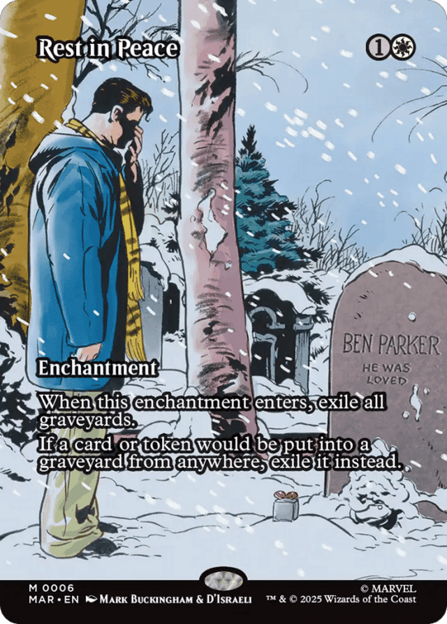 If Rest in Peace is destroyed by a spell, Rest in Peace will be exiled and then the spell will be put into its owner's graveyard. — If a card is discarded while Rest in Peace is on the battlefield, abilities that function when a card is discarded (such as madness) still work, even though that card never reaches a graveyard. In addition, spells or abilities that check the characteristics of a discarded card (such as Chandra Ablaze's first ability) can find that card in exile. — While Rest in Peace is on the battlefield, abilities that trigger whenever a creature dies won't trigger because cards and tokens are never put into a player's graveyard.