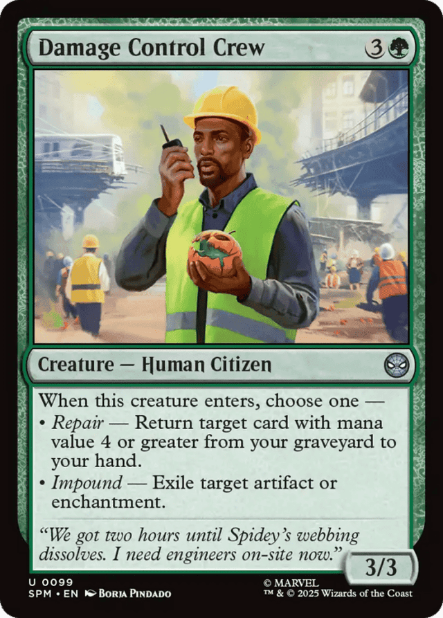 When this creature enters, choose one — • Repair — Return target card with mana value 4 or greater from your graveyard to your hand. • Impound — Exile target artifact or enchantment.