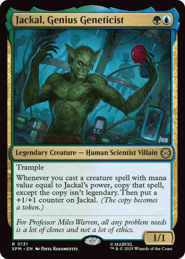 Trample Whenever you cast a creature spell with mana value equal to Jackal's power, copy that spell, except the copy isn't legendary. Then put a +1/+1 counter on Jackal. (The copy becomes a token.)