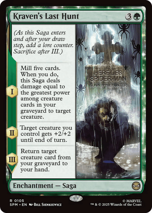(As this Saga enters and after your draw step, add a lore counter. Sacrifice after III.) I — Mill five cards. When you do, this Saga deals damage equal to the greatest power among creature cards in your graveyard to target creature. II — Target creature you control gets +2/+2 until end of turn. III — Return target creature card from your graveyard to your hand.