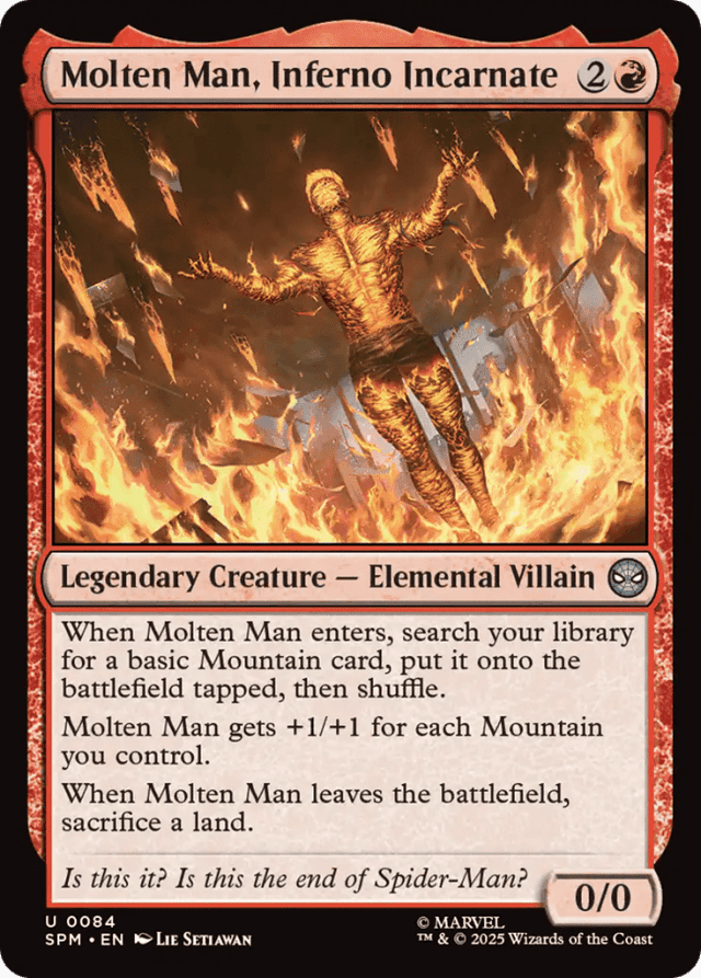 When Molten Man enters, search your library for a basic Mountain card, put it onto the battlefield tapped, then shuffle. Molten Man gets +1/+1 for each Mountain you control. When Molten Man leaves the battlefield, sacrifice a land.