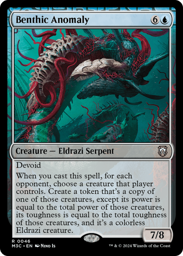 A card with devoid is just colorless. It's not colorless and the colors of mana in its mana cost. — Any enters-the-battlefield abilities of the copied creature will trigger when the token enters the battlefield. Any "as [this creature] enters the battlefield" or "[this creature] enters the battlefield with" abilities of the creature will also work. — Benthic Anomaly's triggered ability will resolve before Benthic Anomaly does. If Benthic Anomaly is countered or otherwise leaves the stack in response to that triggered ability, the triggered ability will still resolve as normal. — Devoid doesn't affect the color identity of the card for the purposes of the Commander variant. For example, while Abstruse Appropriation is colorless because it has devoid, its color identity is still white and black, and it can't be included in a Commander deck where the commander's color identity doesn't include both white and black. — Devoid works in all zones, not just on the battlefield. — If a card loses devoid, it will still be colorless. This is because effects that change an object's color (like the one created by devoid) are considered before the object loses devoid. — If the copied creature has {X} in its mana cost, X is 0. — If the copied creature is copying something else, then the token enters the battlefield as whatever that creature copied, with the listed exceptions. — If the copied creature is itself a token, the token created by Benthic Anomaly's ability copies the original characteristics of that token as stated by the effect that created it, with the listed exception. — Other cards and abilities can give a card with devoid a color. If that happens, it's just the new color, not that color and colorless. — The token copies exactly what was printed on the original card and nothing else, with the listed exceptions (unless that creature is itself copying something else; see below). It doesn't copy whether that creature is tapped or untapped, whether it has any counters on it or Auras attached to it, or any non-copy effects that have changed its power, toughness, types, color, and so on. — The token is an Eldrazi creature instead of its other types and subtypes and is colorless instead of retaining any of its colors. It retains any supertypes it had, such as legendary or snow. These are copiable values of the token that other effects may copy.