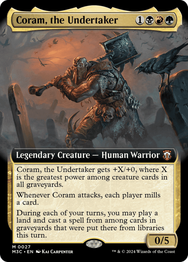 Coram gets +X/+0, where X is the greatest power among creature cards in all graveyards. Whenever Coram attacks, each player mills a card. During each of your turns, you may play a land and cast a spell from among cards in graveyards that were put there from libraries this turn.