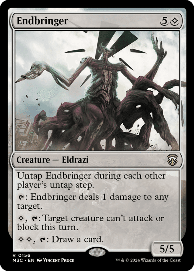 Activating the second activated ability after a creature has legally been declared as an attacker or blocker won't change or undo that attack or block. — Endbringer untaps at the same time as the active player's permanents. You can't choose to not untap it at that time. — If an effect states that Endbringer doesn't untap during your untap step, that effect won't apply during another player's untap step.