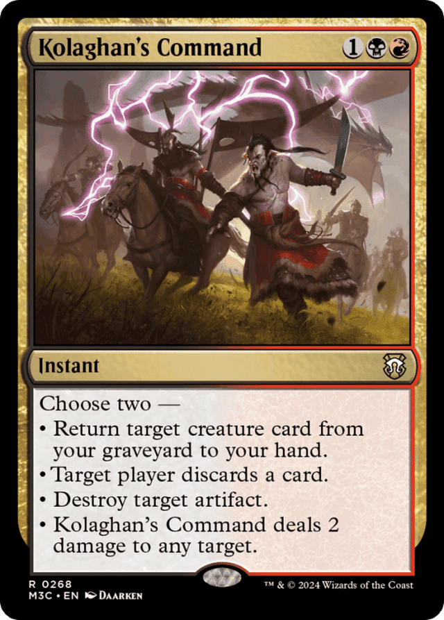 Choose two — • Return target creature card from your graveyard to your hand. • Target player discards a card. • Destroy target artifact. • Kolaghan's Command deals 2 damage to any target.