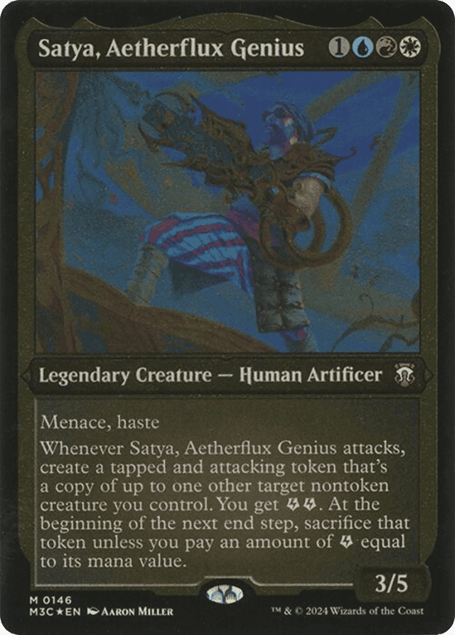 Menace, haste Whenever Satya attacks, create a tapped and attacking token that's a copy of up to one other target nontoken creature you control. You get {E}{E} (two energy counters). At the beginning of the next end step, sacrifice that token unless you pay an amount of {E} equal to its mana value.