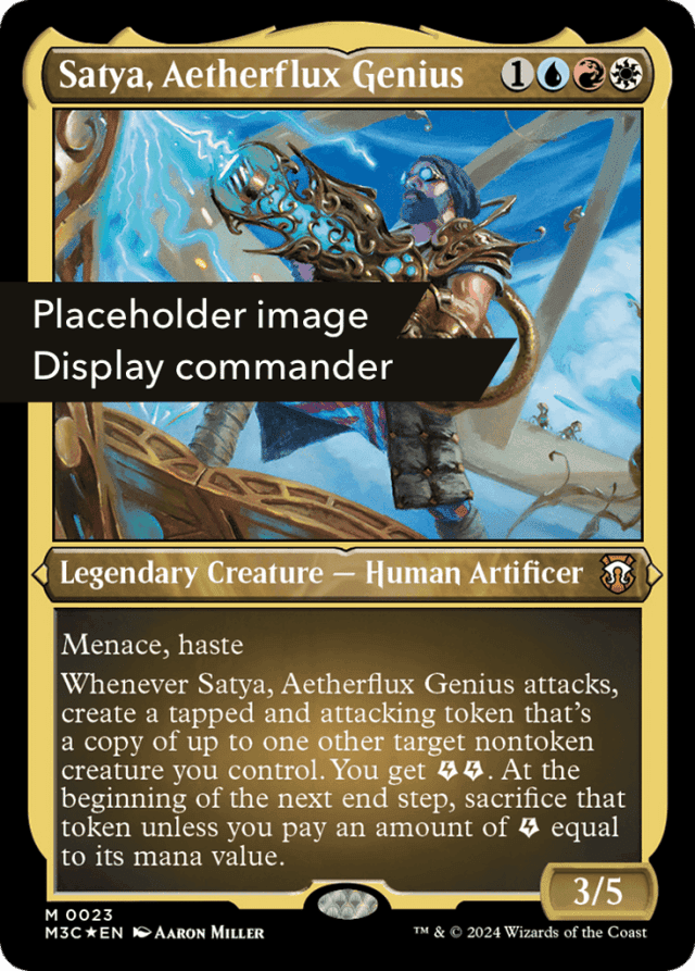 Menace, haste Whenever Satya attacks, create a tapped and attacking token that's a copy of up to one other target nontoken creature you control. You get {E}{E} (two energy counters). At the beginning of the next end step, sacrifice that token unless you pay an amount of {E} equal to its mana value.