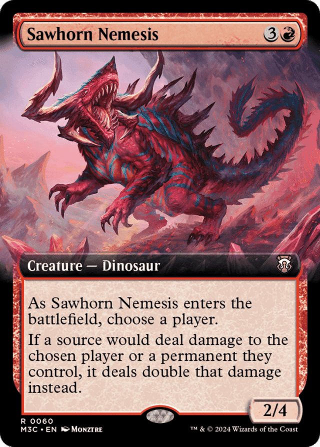 If another effect (or effects) modifies how much damage a source would deal to the chosen player or a permanent they control (for example, by preventing some of that damage), the player being dealt damage or the controller of the permanent being dealt damage chooses the order in which any such effects, including the effect of Sawhorn Nemesis, apply. If all of the damage is prevented before Sawhorn Nemesis's effect would apply, its effect no longer applies. — If damage dealt is being divided or assigned among multiple permanents or players, that damage is divided or assigned before any effects that modify how much damage will be dealt. For example, if you attack the chosen player with a 5/5 creature with trample and it's blocked by a 2/2 creature they control, you can assign 2 damage to the blocker and 3 damage to the defending player. Those amounts are then doubled to 4 and 6, respectively. — The damage is dealt by the same source as the original source of damage. The doubled damage isn't dealt by Sawhorn Nemesis unless it was the original source of damage. — The protector of a battle with the Siege subtype is not that battle's controller.