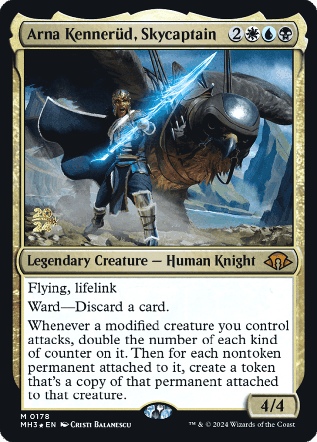 A creature that is equipped is considered modified no matter who controls the Equipment that's attached to it. — A creature with a counter on it is considered modified no matter what kind of counter it is or which player put it on that creature. — An Aura controlled by another player does not cause a creature you control to be modified. — If, for any reason, an Aura token that would be created with Arna Kennerüd's last ability can't be attached to the appropriate creature, that token isn't created. If an Equipment token that can't be attached to the appropriate creature would be created, that token enters the battlefield unattached. — To double the number of each kind of counter on a permanent, put another counter on it for each counter it already has. Effects that interact with counters being put onto permanents, such as the effect of Branching Evolution, apply as appropriate.