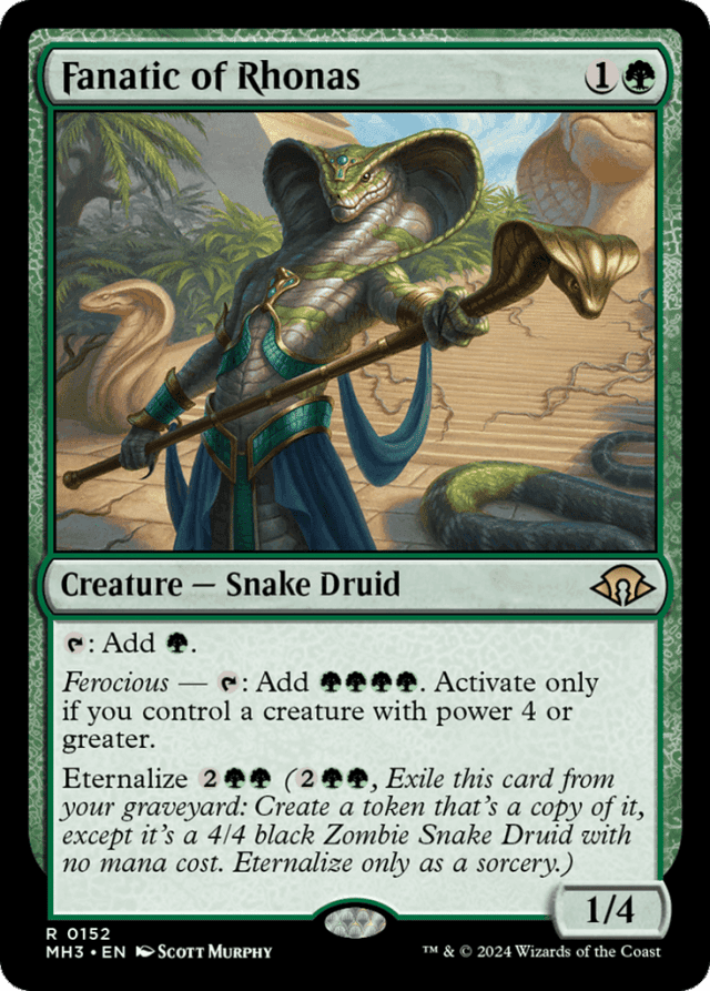 {T}: Add {G}. Ferocious — {T}: Add {G}{G}{G}{G}. Activate only if you control a creature with power 4 or greater. Eternalize {2}{G}{G} ({2}{G}{G}, Exile this card from your graveyard: Create a token that's a copy of it, except it's a 4/4 black Zombie Snake Druid with no mana cost. Eternalize only as a sorcery.)