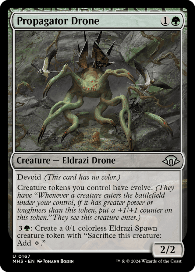 Devoid (This card has no color.) Creature tokens you control have evolve. (They have "Whenever a creature you control enters, if it has greater power or toughness than this token, put a +1/+1 counter on this token." They see this creature enter.) {3}{G}: Create a 0/1 colorless Eldrazi Spawn creature token with "Sacrifice this token: Add {C}."