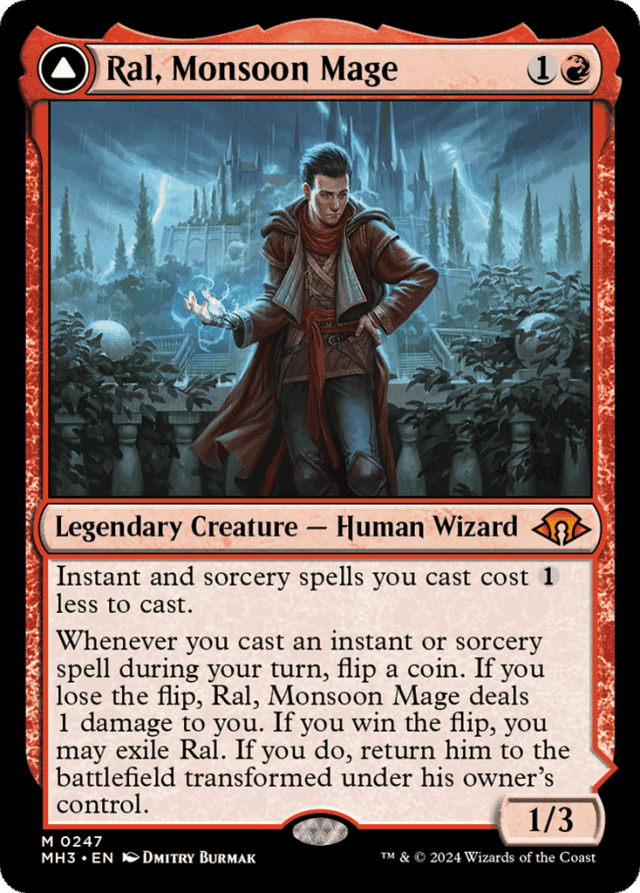 A transforming double-faced card enters the battlefield with its front face up by default, unless a spell or ability instructs you to put it onto the battlefield transformed or allows you to cast it transformed, in which case it enters with its back face up. — Each face of a transforming double-faced card has its own set of characteristics: name, types, subtypes, abilities, and so on. While a transforming double-faced permanent is on the battlefield, consider only the characteristics of the face that's currently up. The other set of characteristics is ignored. — Each transforming double-faced card in this set is cast with its front face up. In every zone other than the battlefield, consider only the characteristics of its front face. If it is on the battlefield, consider only the characteristics of the face that's up; the other face's characteristics are ignored. — If Ral, Monsoon Mage is exiled and returns transformed while one or more instances of his triggered ability are still on the stack, those abilities will still resolve. However, if the controller of one of those abilities wins the flip, nothing will happen since the object that ability refers to is no longer on the battlefield. — If one of the exiled cards has {X} in its mana cost, you must choose 0 as the value of X when casting it without paying its mana cost. — If some of the targets are illegal as Ral, Leyline Prodigy's second loyalty ability tries to resolve, the original division of damage still applies and the damage that would have been dealt to the illegal targets is lost. It won't be dealt instead to a legal target. If all of the targets are illegal, the ability won't resolve and none of its effects will happen. You won't draw a card. — If you are instructed to put a card that isn't a double-faced card onto the battlefield transformed, it will not enter the battlefield at all. In that case, it stays in the zone it was previously in. For example, if a single-faced card is a copy of Ral, Monsoon Mage, choosing to exile that permanent during the resolution of its triggered ability will cause it to remain in exile. — If you cast a spell "without paying its mana cost," you can't choose to cast it for any alternative costs. You can, however, pay additional costs, such as kicker costs. If the spell has any mandatory additional costs, those must be paid to cast it. — In some rare cases, a spell or ability may cause Ral, Monsoon Mage to transform while he's a creature (front face up) on the battlefield. If this happens, Ral, Leyline Prodigy won't have any loyalty counters on him and will subsequently be put into his owner's graveyard. — In the Commander variant, a double-faced card's color identity is determined by the mana costs and mana symbols in the rules text of both faces combined. If either face has a color indicator or basic land type, those are also considered. For example, Ral, Monsoon Mage's color identity is blue and red, since its front face is red and its back face has a blue and red color indicator. — The back face of a transforming double-faced card usually has a color indicator that defines its color. Colorless back faces, such as lands, do not. — The first ability of Ral, Leyline Prodigy will count any instant and sorcery spells you've cast that turn, including ones that were countered, didn't resolve for other reasons, or are still on the stack. — The mana value of a transforming double-faced card is the mana value of its front face, no matter which face is up. — You can activate one of Ral, Leyline Prodigy's loyalty abilities the turn he enters the battlefield. However, you may do so only during one of your main phases when the stack is empty. For example, if Ral, Leyline Prodigy enters the battlefield during combat, there will be an opportunity for your opponent to remove him before you can activate one of his abilities. — You choose how many targets Ral, Leyline Prodigy's second loyalty ability has and how the damage is divided as you activate the ability. Each target must receive at least 1 damage. — You flip a coin as Ral, Monsoon Mage's triggered ability resolves. No player may take actions between seeing the result of the flip and the effects that occur based on the result of the flip. — You follow all normal timing rules for spells cast with the permission granted by Ral, Leyline Prodigy's last ability. For example, if one of the exiled cards is a sorcery, you can cast it only during your main phase while the stack is empty.