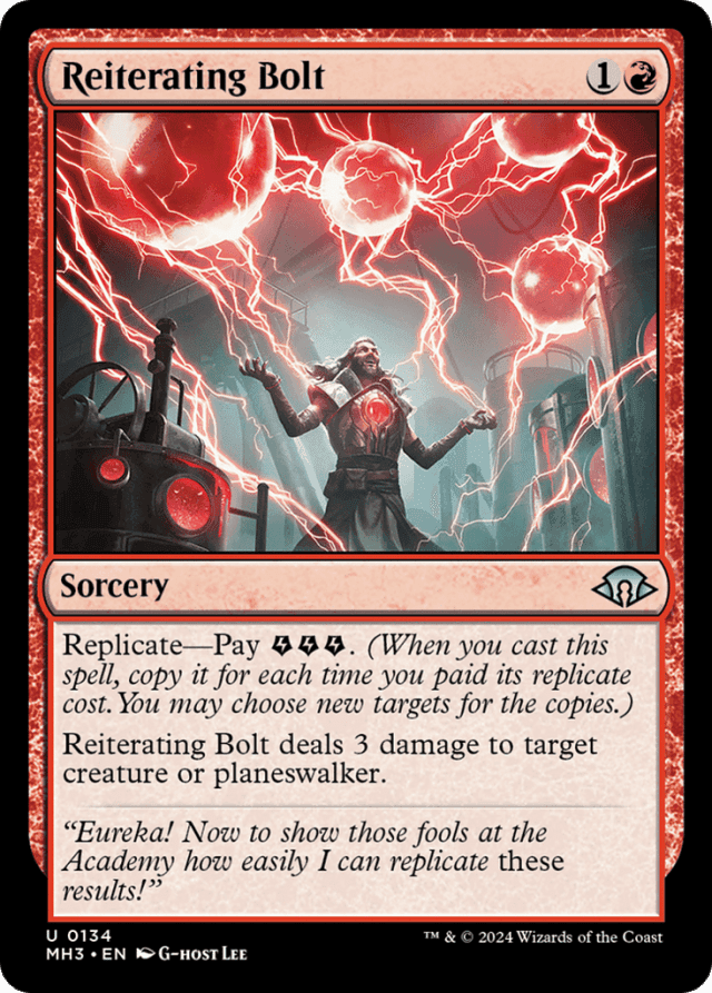 Replicate—Pay {E}{E}{E}. (When you cast this spell, copy it for each time you paid its replicate cost. You may choose new targets for the copies.) Reiterating Bolt deals 3 damage to target creature or planeswalker.